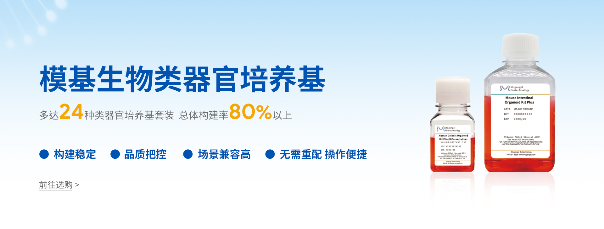廈門(mén)模基生物科技有限公司致力于3D細(xì)胞培養(yǎng)核心原材料的研發(fā)與產(chǎn)業(yè)化升級(jí),是國(guó)內(nèi)一家從科研做起,從實(shí)驗(yàn)研究中一路走來(lái)的全流程自主研發(fā)、自主生產(chǎn)的企業(yè)。目前公司的產(chǎn)品有基質(zhì)膠、類器官培養(yǎng)基、細(xì)胞因子、3D細(xì)胞培養(yǎng)耗材、3D細(xì)胞培養(yǎng)智能顯微鏡等。公司擁有4大技術(shù)研發(fā)中心:分子克隆和細(xì)胞編輯中心、實(shí)驗(yàn)動(dòng)物中心、蛋白表達(dá)和純化平臺(tái)、類器官質(zhì)檢系統(tǒng)和自動(dòng)化。